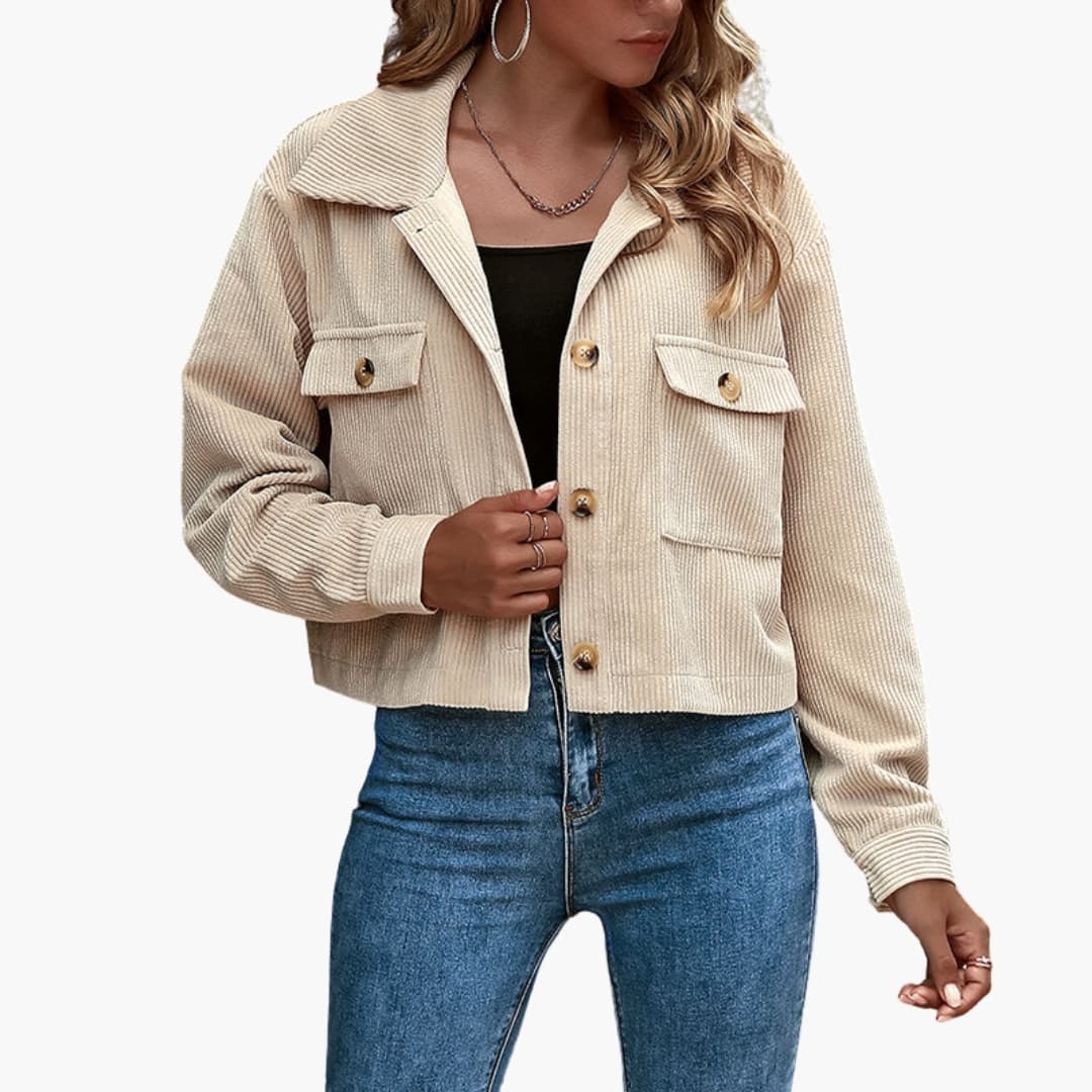 This women’s transitional jacket is made from corduroy with a clean textured finish. Designed with a structured lapel collar and front button closure, it includes two flap chest pockets for utility and detail. Long sleeves and a straight cut provide balance, while the cropped length makes it suitable for layering across different outfits.