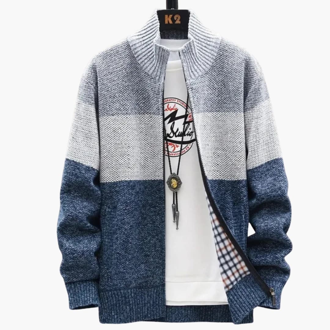 Men’s Knit Zip Cardigan with High Collar and Ribbed Hem