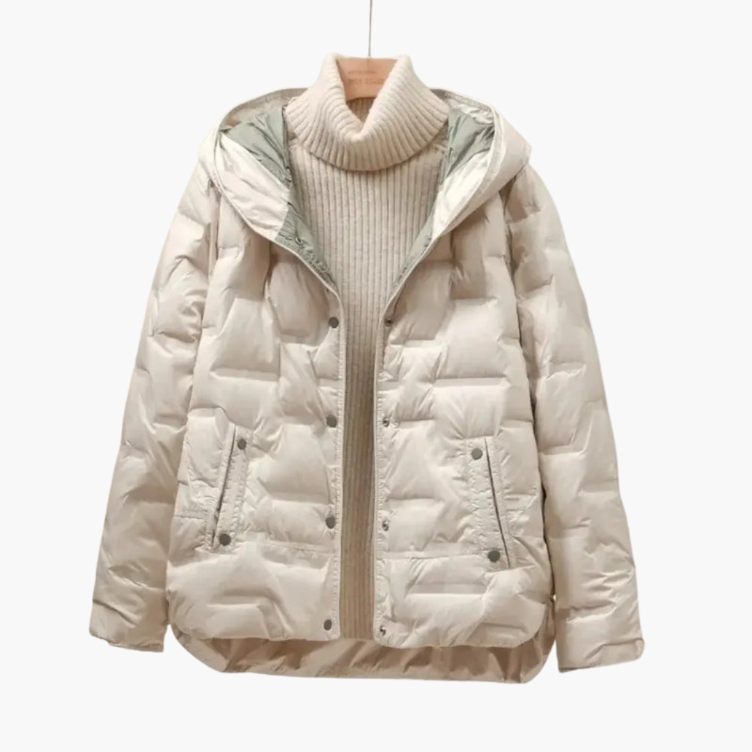 Women’s quilted puffer jacket featuring an attached hood and front snap fastening