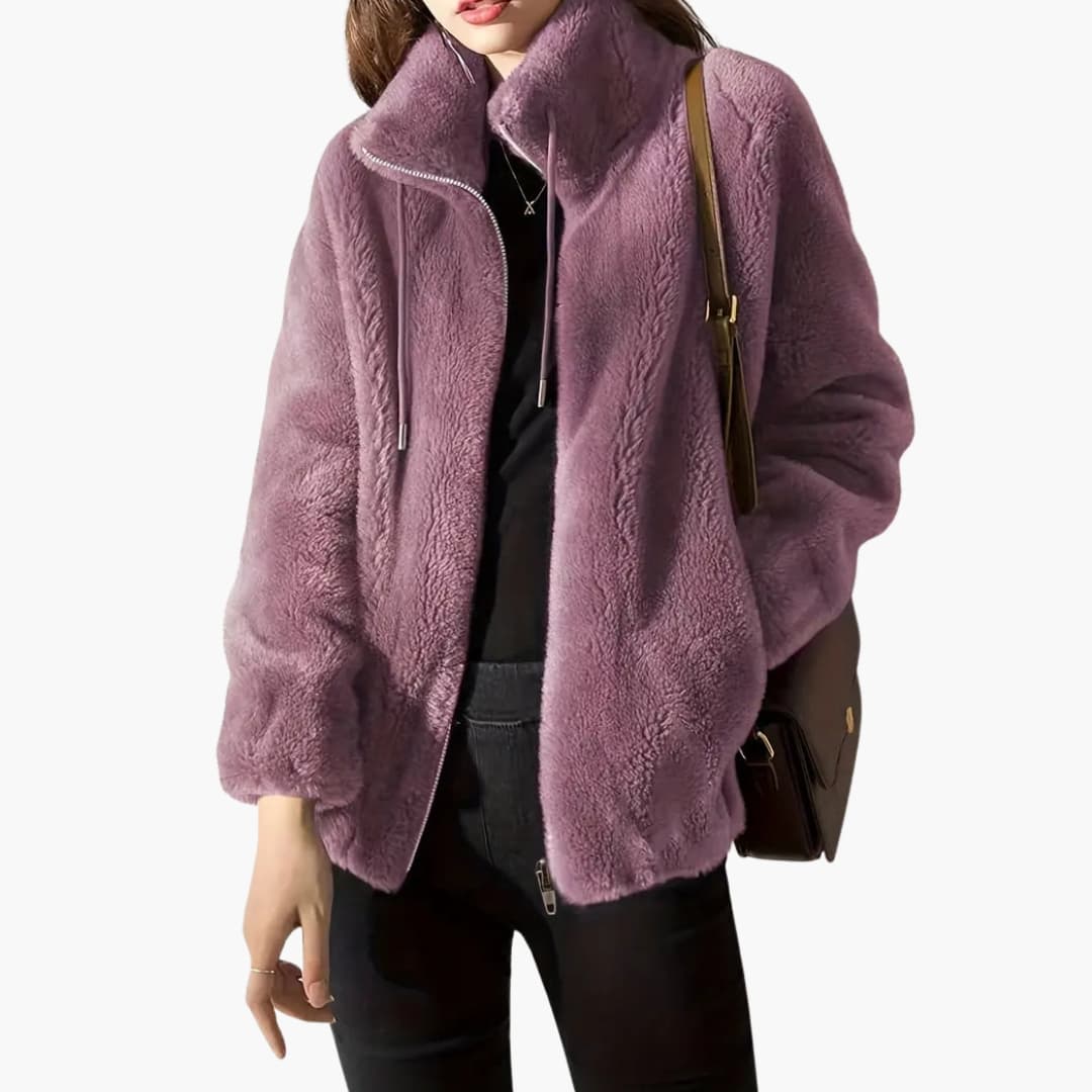 Women’s teddy coat with zipper and adjustable hem.